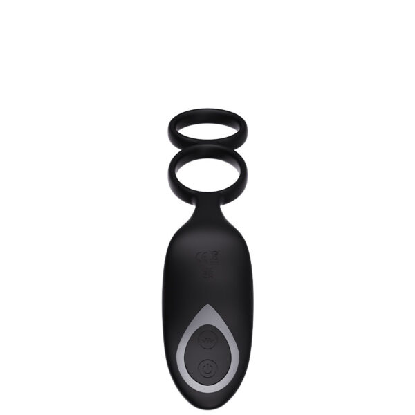 Anel peniano duplo recarregável com plug anal. Possui 9 modos de vibração e 9 modos de vai e vem.