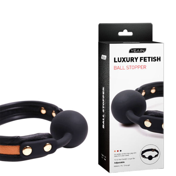 Mordaça de bola, possui interior forrado e ajuste com fivela.