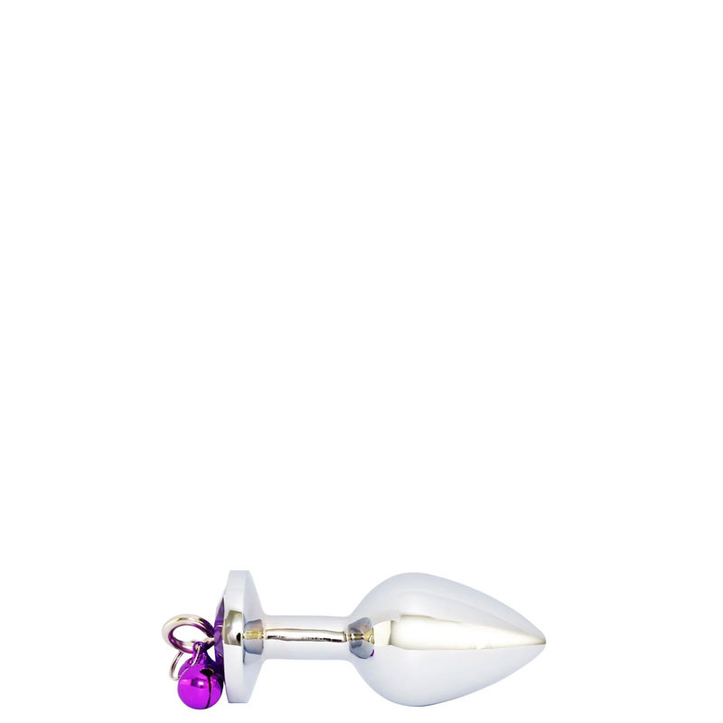 Plug anal em metal pequeno, possui em sua base uma pedra colorida lapidada, sino e guia com corrente.
